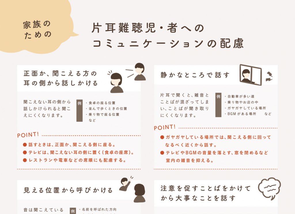 - きこいろでは、当事者以外にも馴染みやすい総称として「片耳難聴」を使用。